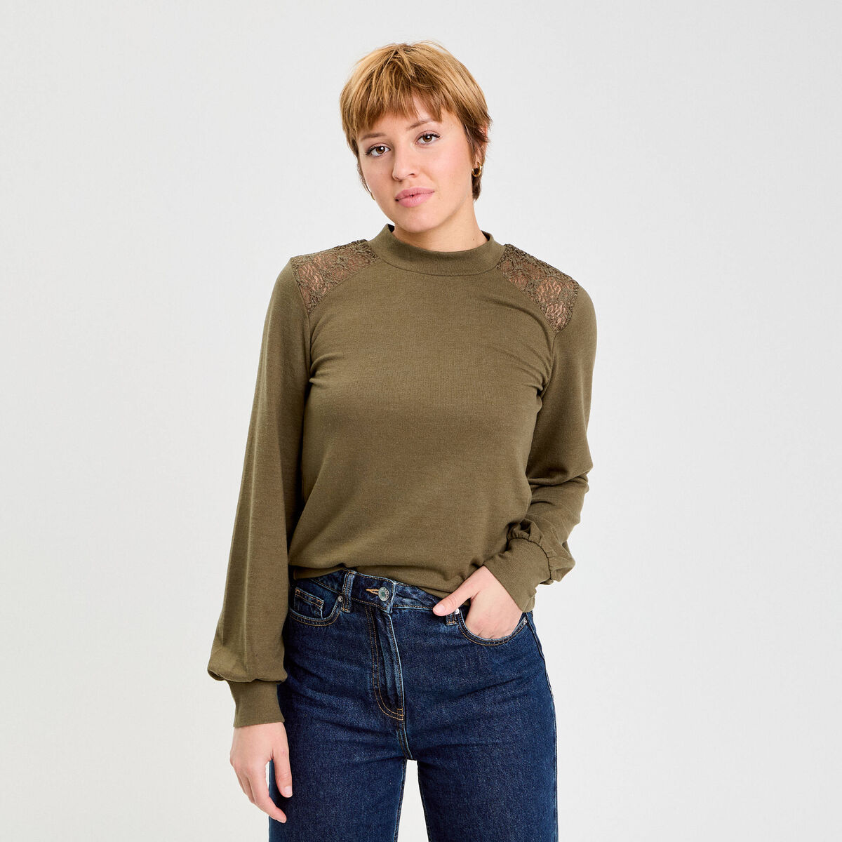 T-shirt manches longues détails ajourés vert kaki femme