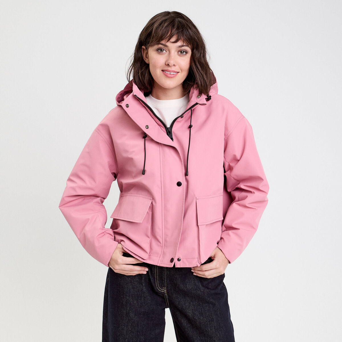 Veste courte bas resserré à capuche rose clair femme