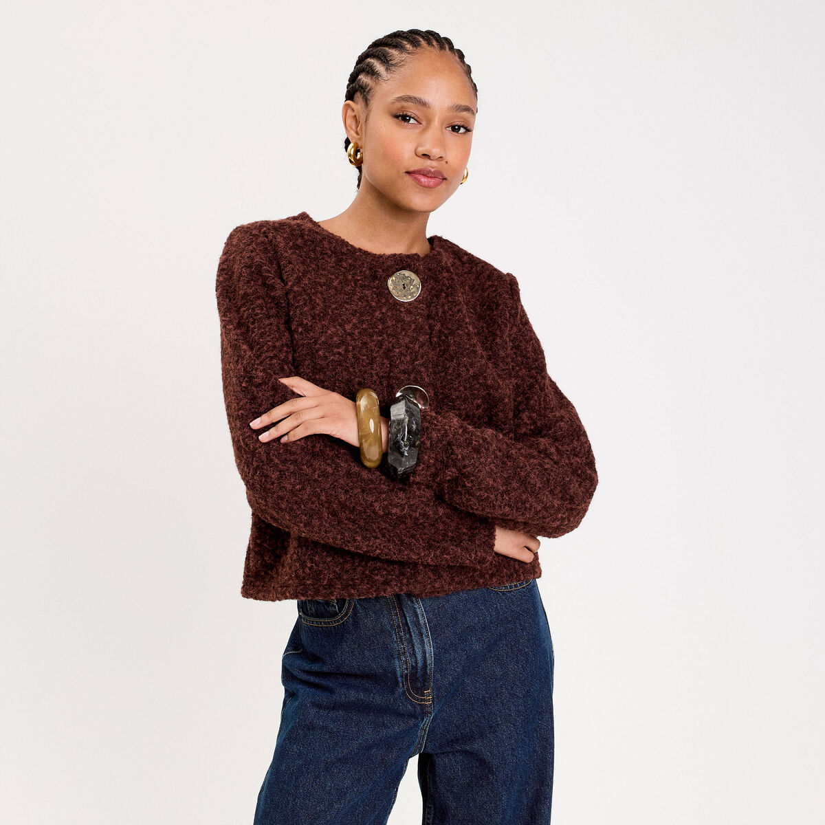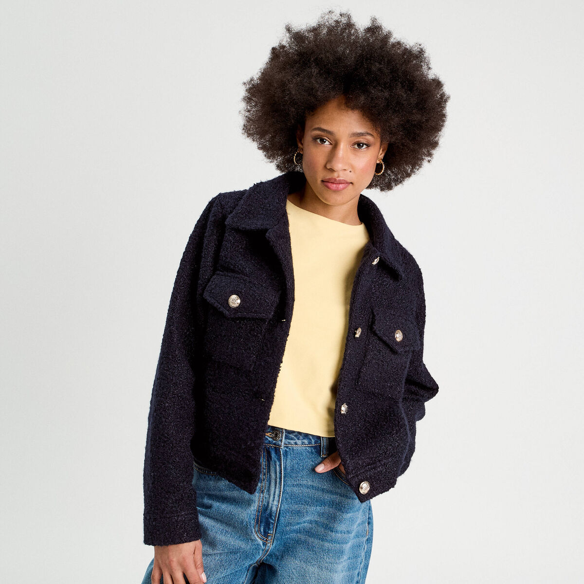 Veste boutonnée bouclette bleu marine femme