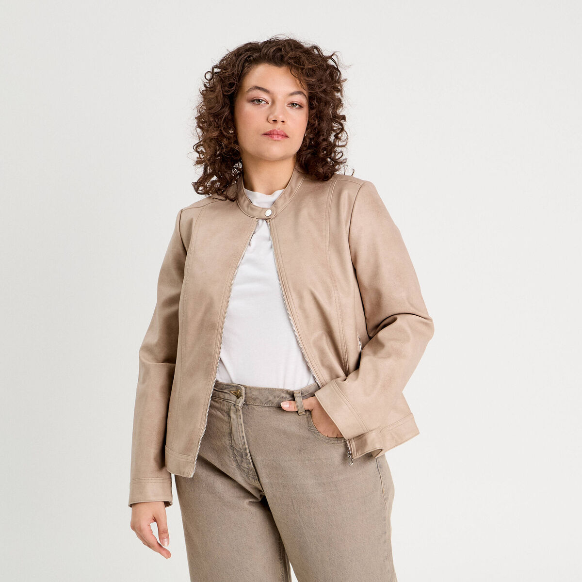 Veste droite cropped aspect daim beige femme