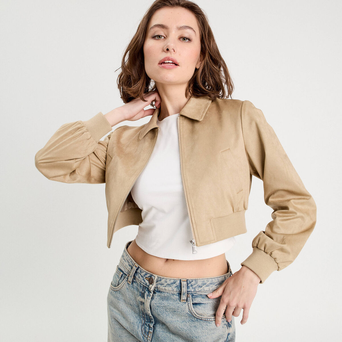 Veste courte zippée suédine beige femme