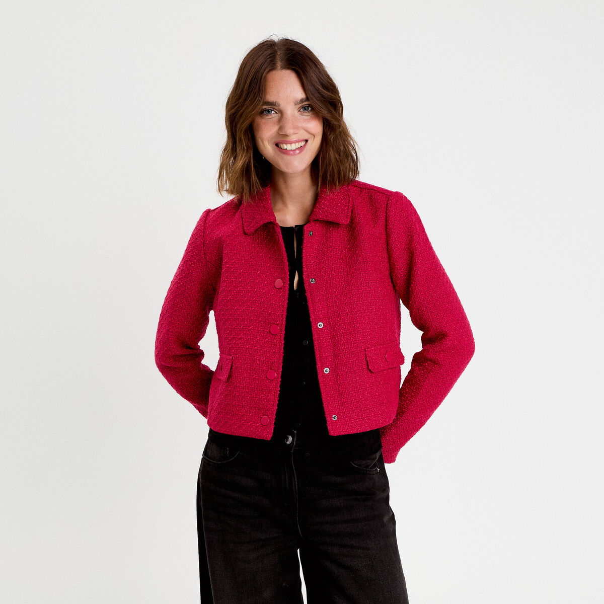 Veste droite cropped en tweed rouge clair femme