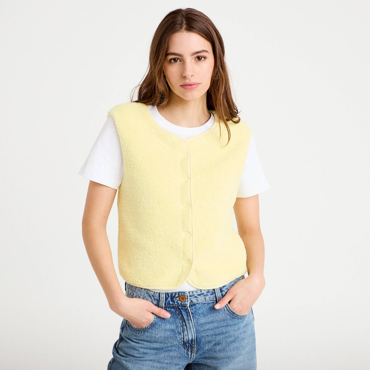 Veste sans manches effet polaire jaune clair femme