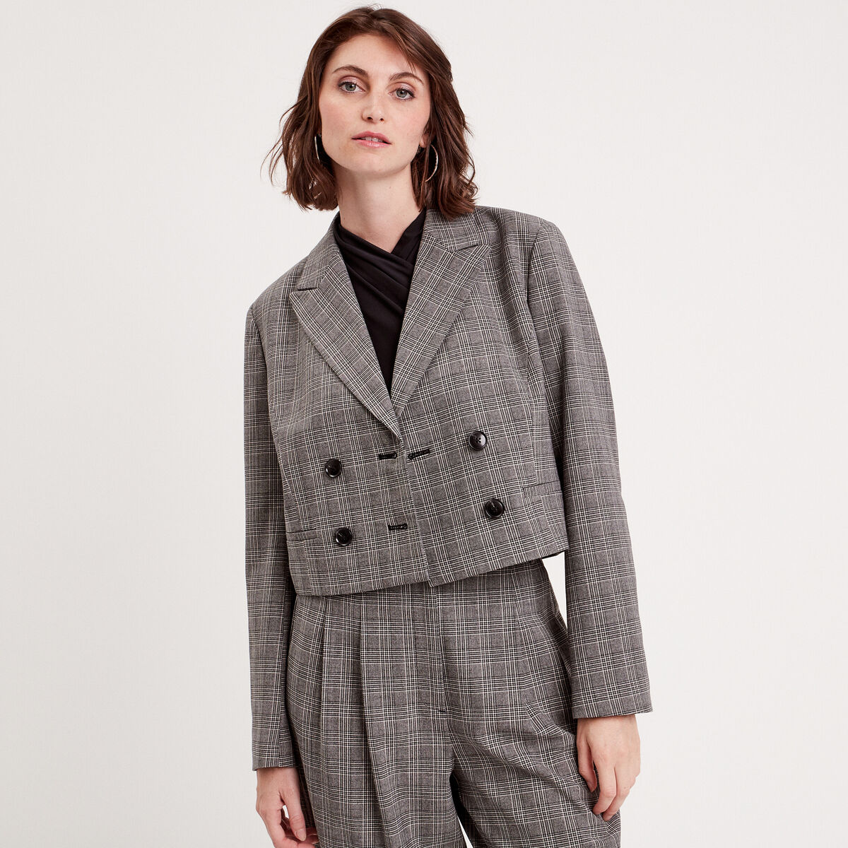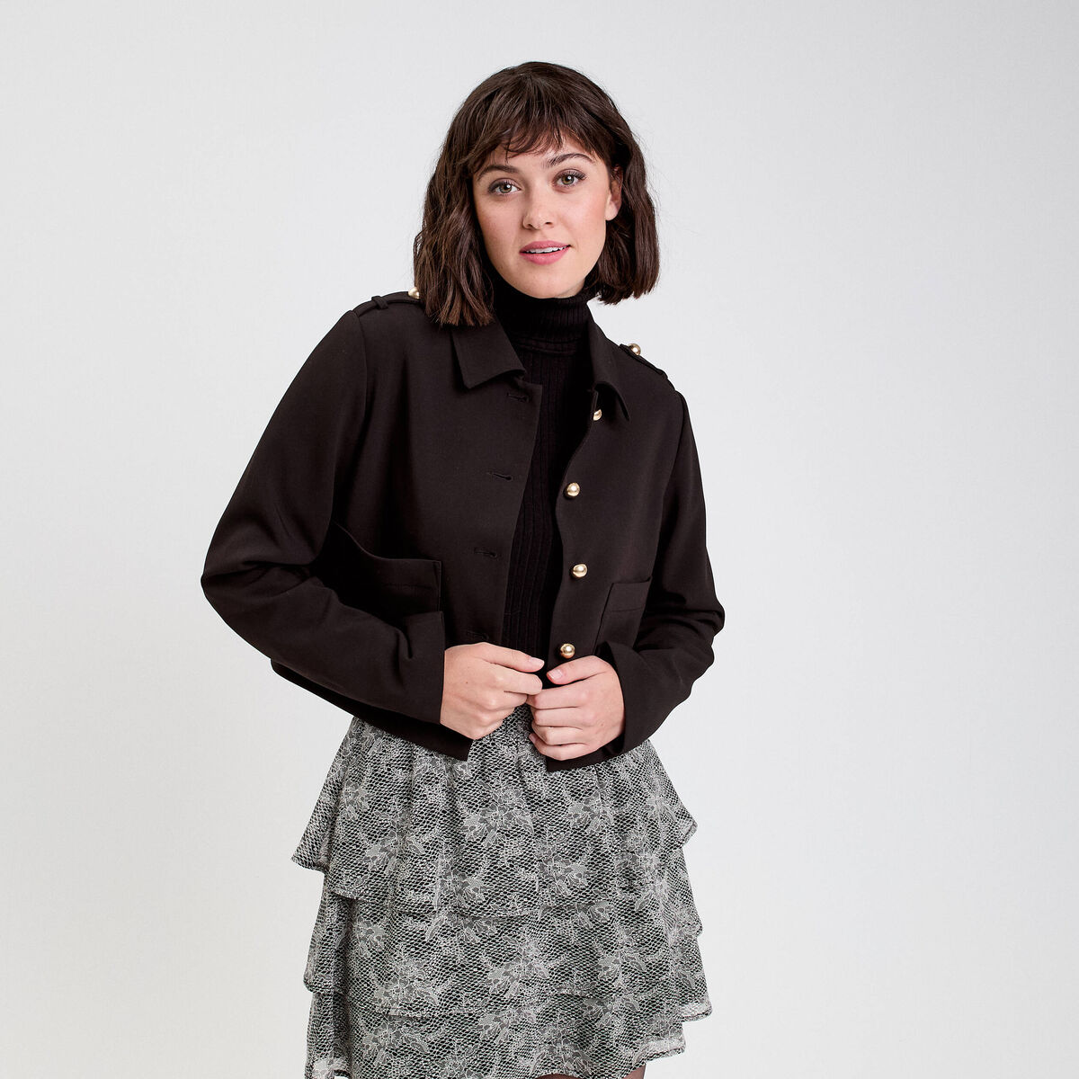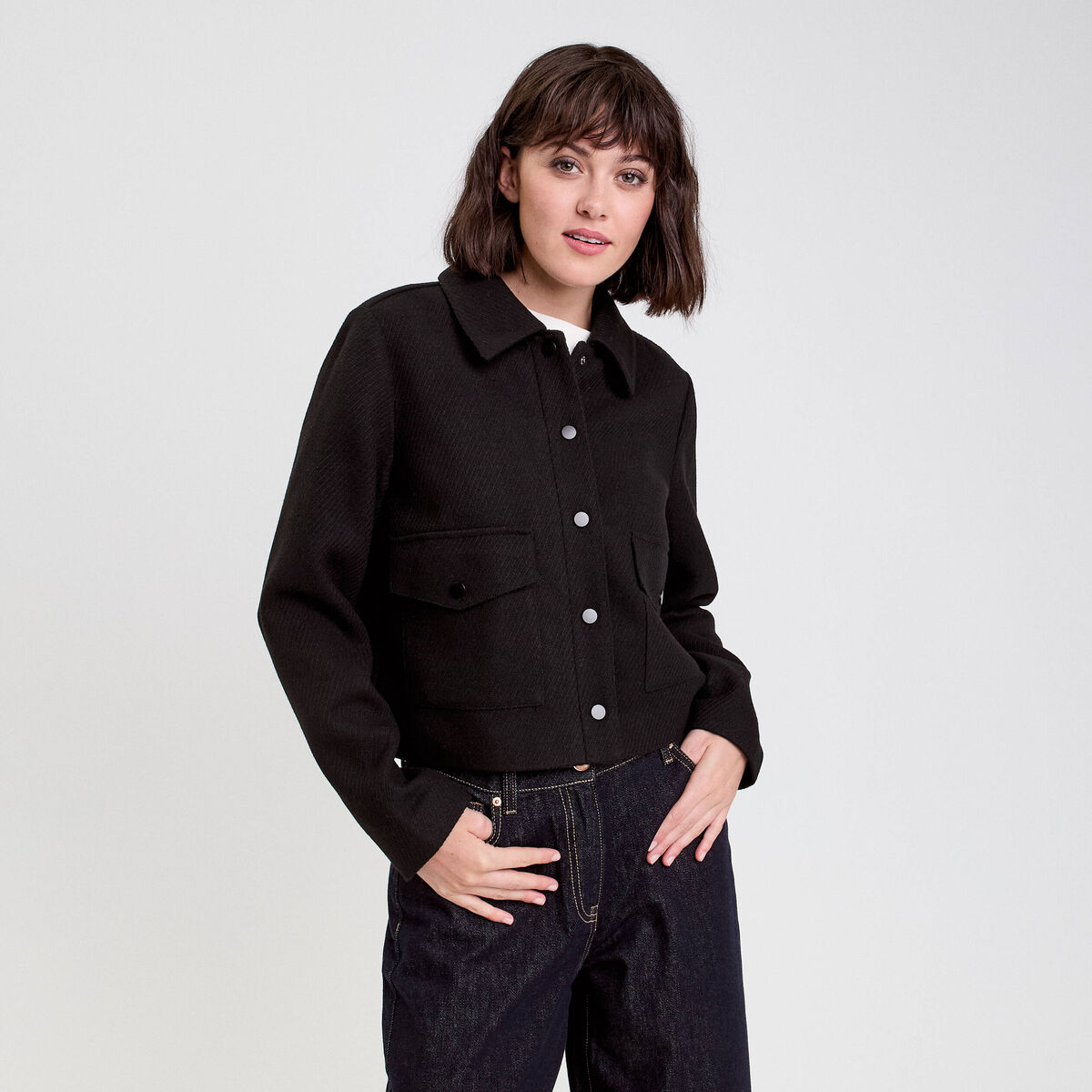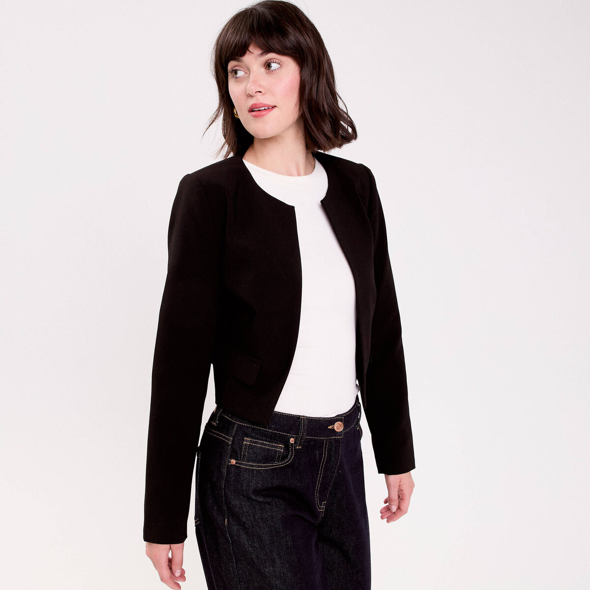 Veste droite courte col classique noir femme