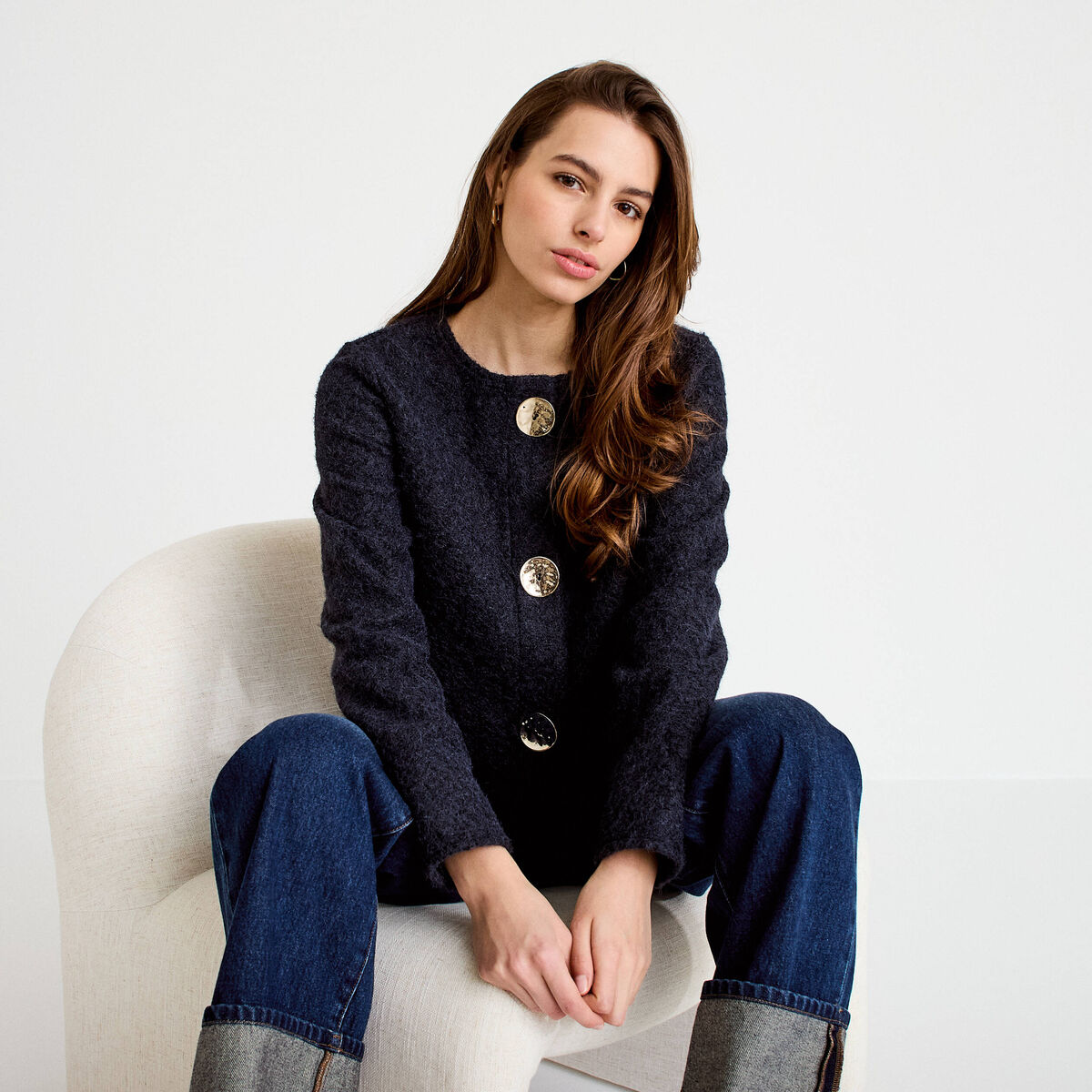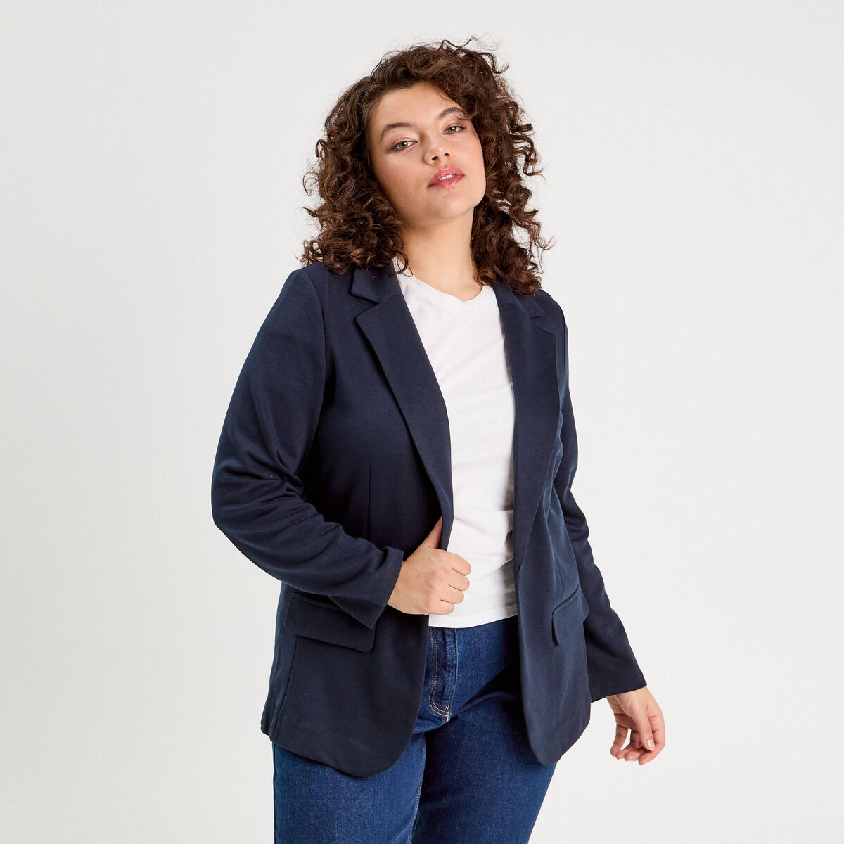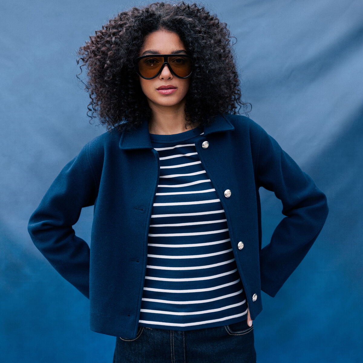 Veste droite courte col classique bleu marine femme