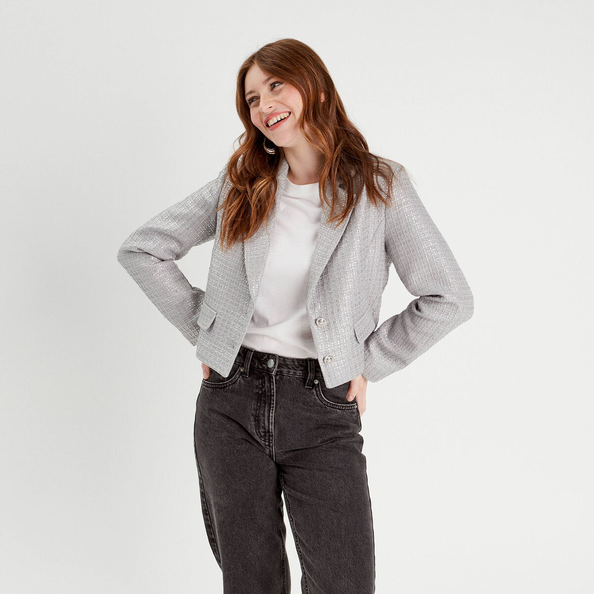 Veste blazer tweed gris argent femme