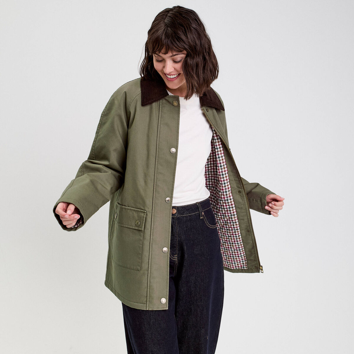 Veste droite mi-longue en coton vert kaki femme