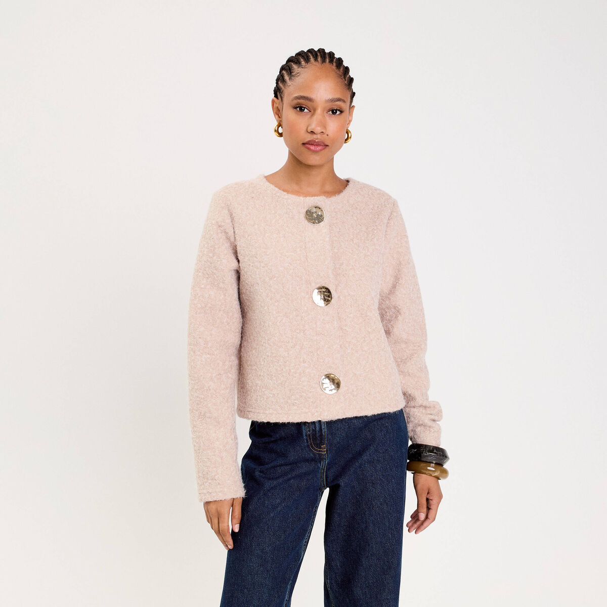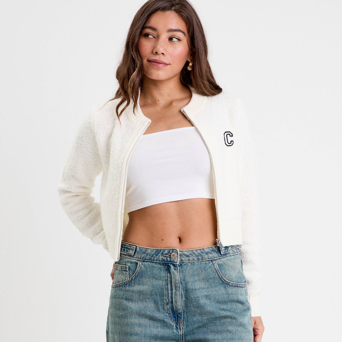 Veste courte ajustée bouclette ecru femme