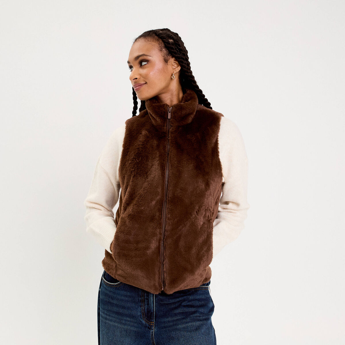 Veste courte ajustée sans manches marron femme