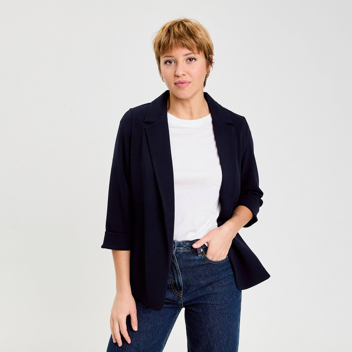 Veste cintrée col chale manches 3/4 bleu marine femme
