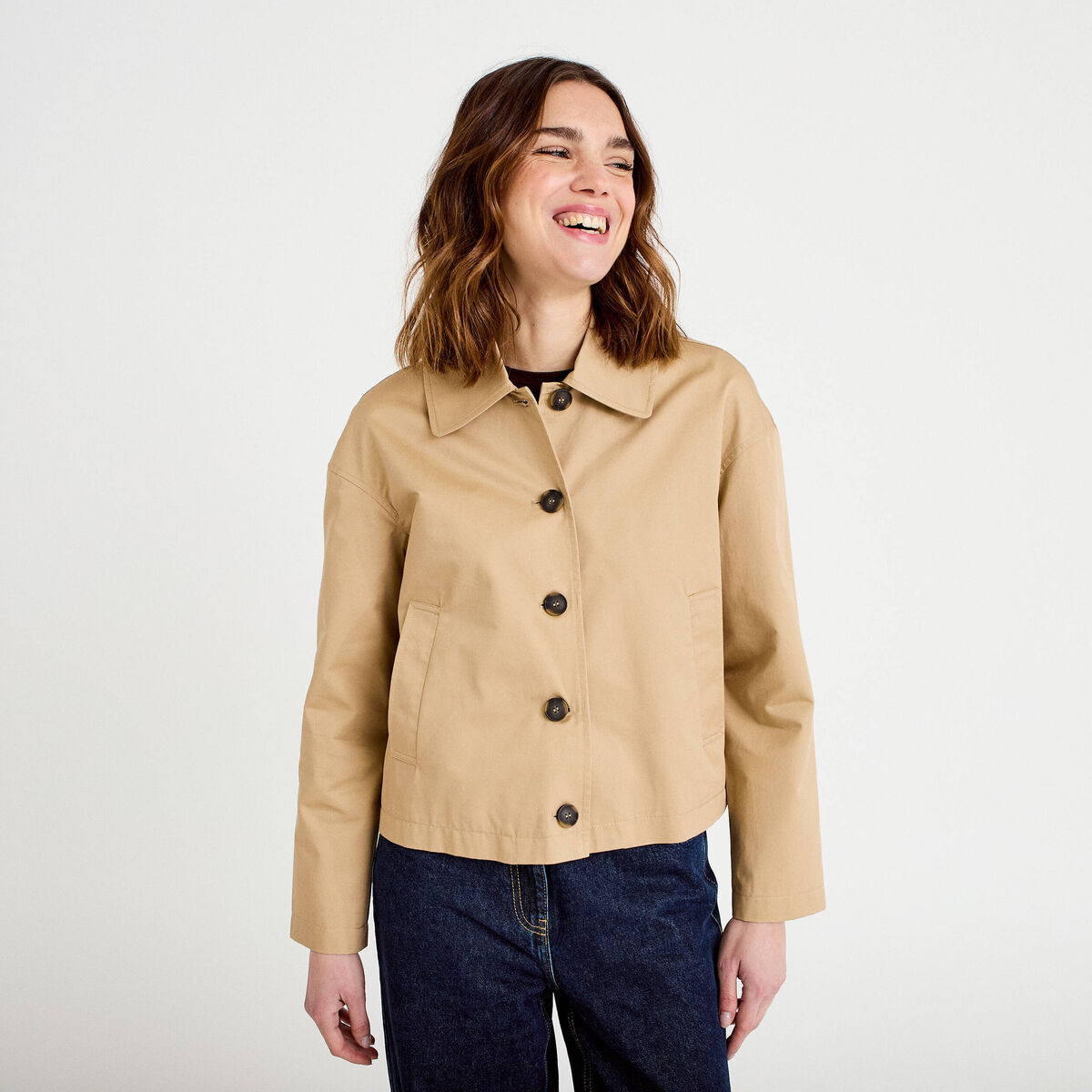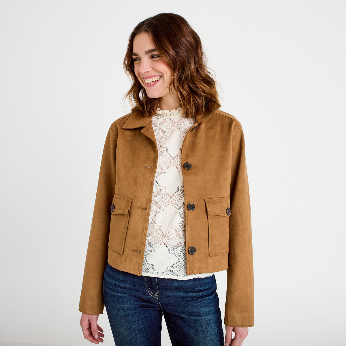 Veste droite cropped aspect daim camel femme